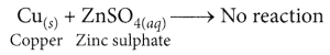 In this reaction, zinc metal being more reactive than copper displaces copper from copper sulphate solution. If however, a strip of copper metal is placed in zinc sulphate solution, then no reaction occurs. This is because copper metal is less reactive than zinc metal and hence, cannot displace zinc from its salt solution.
